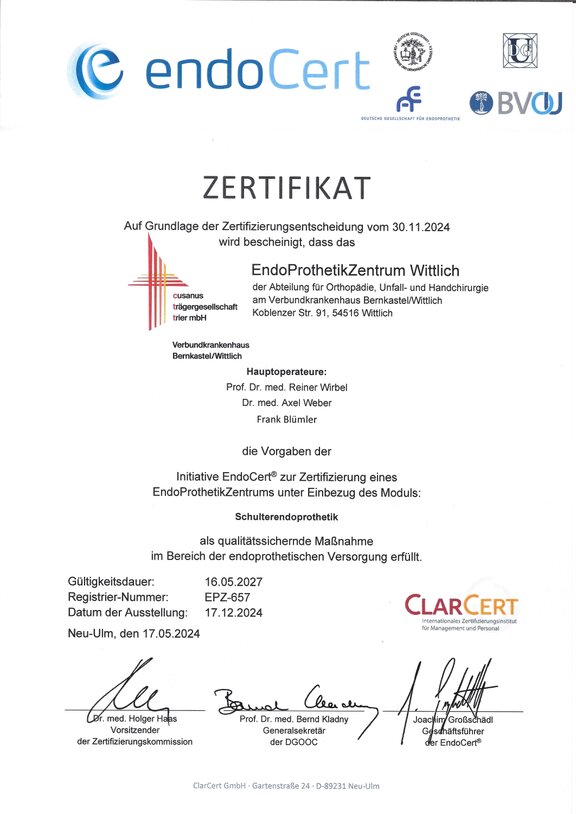 Im Februar 2025 wurde unser Zentrum als EndoProthetikZentrum der Maximalversorgung (EPZmax) zertifiziert – ein Qualitätssiegel für besondere Spezialisierung, höchste medizinische Standards und interdisziplinäre Zusammenarbeit. Zudem ist es das erste Zentrum der Region mit einer Zertifizierung auch für Schulterprothesen.