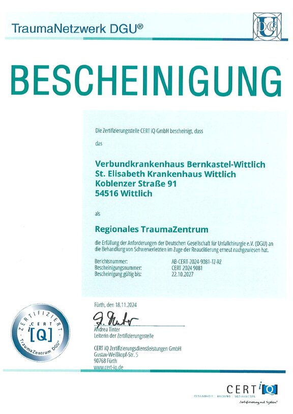 Das Verbundkrankenhaus Bernkastel/Wittlich ist als "Regionales TraumaZentrum" im TraumaNetzwerk der Deutschen Gesellschaft für Unfallchirurgie (DGU) TNW Eifel-Mosel zertifiziert. Damit verfügt das Verbundkrankenhaus über alle Voraussetzungen für eine optimale Behandlung von schwerverletzten Patienten. Diese werden bei uns rund um die Uhr entlang einer durchgehenden Behandlungskette versorgt – vom Rettungsdienst über Notfallversorgung, OP und Intensivstation bis zur Rehabilitation.