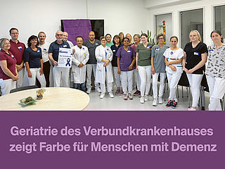 Unter dem Motto „Wir zeigen Farbe“ setzen die Mitarbeitenden der Geriatrie ein sichtbares Zeichen: Sie tragen lila Schleifen