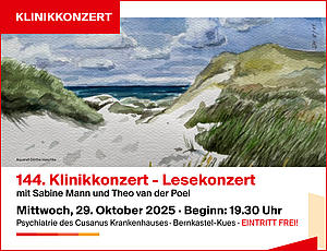 Das Verbundkrankenhaus Bernkastel/Wittlich lädt herzlich zum 144. Klinikkonzert ein, das am Mittwoch, den 29. Oktober 2025, um 19.30 Uhr im Tanz- und Bewegungssaal der Psychiatrie des Cusanus Krankenhauses in Bernkastel-Kues stattfindet.