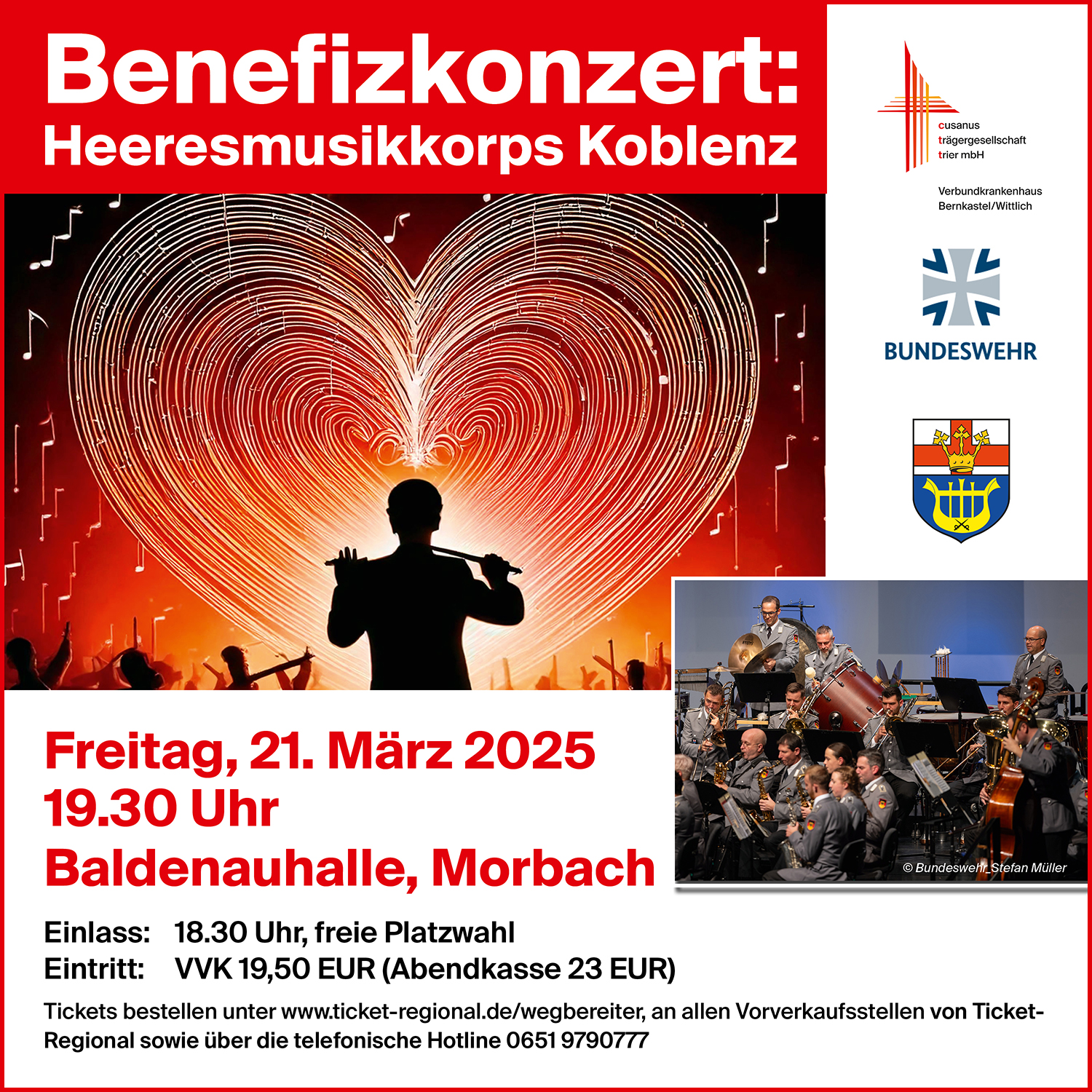 Der Förderverein des Verbundkrankenhauses Bernkastel/Wittlich lädt zu einem besonderen Benefizkonzert ein: Am Freitag, 21. März 2025, um 19:30 Uhr (Einlass ab 18:30 Uhr) wird die Baldenauhalle in Morbach zum Schauplatz eines musikalischen Highlights des renommierten Heeresmusikkorps Koblenz.