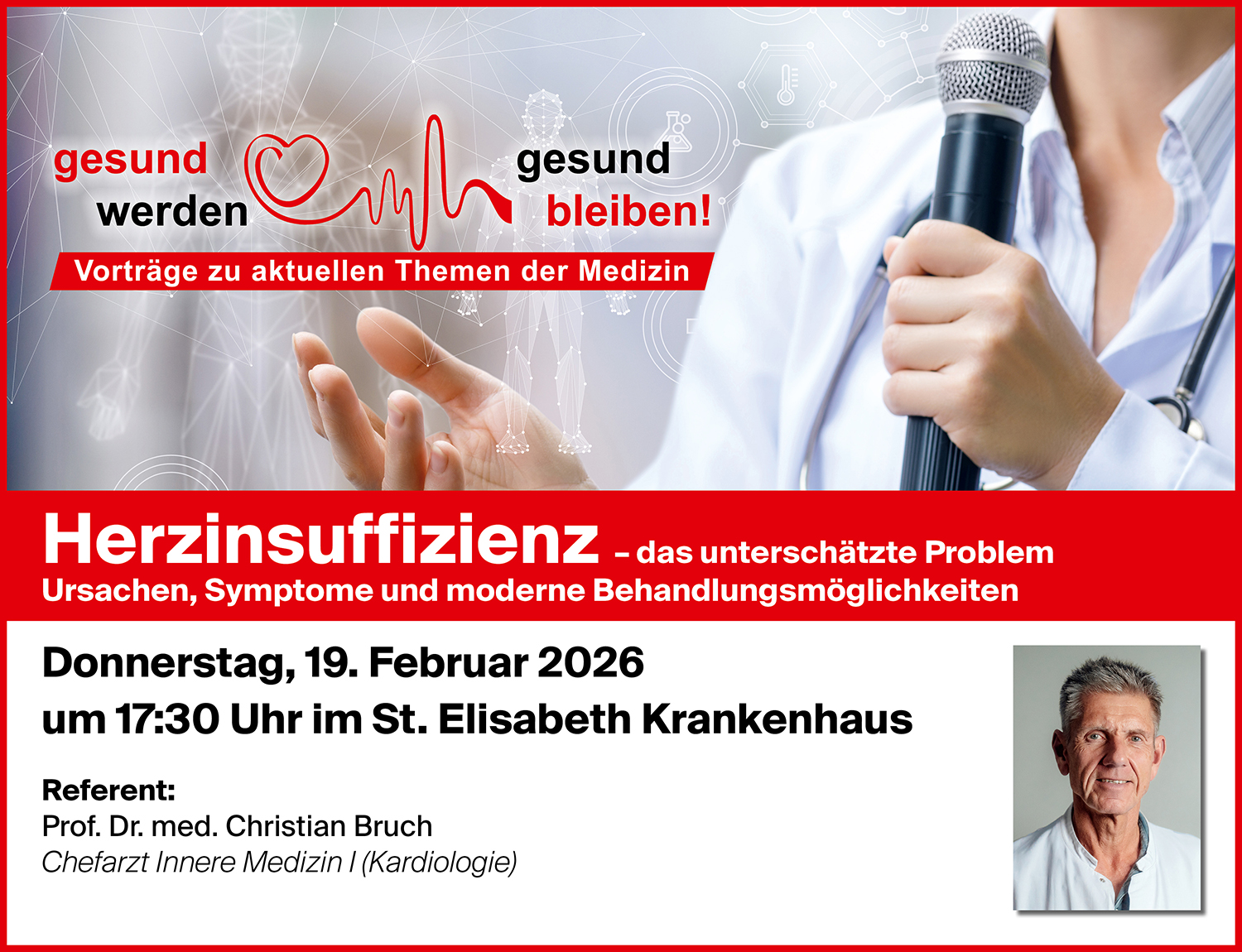 In diesem Vortrag erfahren Sie, wie eine Herzschwäche entsteht, welche Warnzeichen ernst genommen werden sollten und welche diagnostischen und therapeutischen Möglichkeiten heute zur Verfügung stehen. Zudem wird aufgezeigt, wie Betroffene ihren Alltag aktiv unterstützen können.