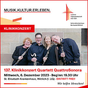 Am Mittwoch, den 6. Dezember 2023 findet um 19.30 Uhr das 137. Klinikkonzert im St. Elisabeth Krankenhaus in Wittlich (Großer Konferenzraum, 1. UG) statt.